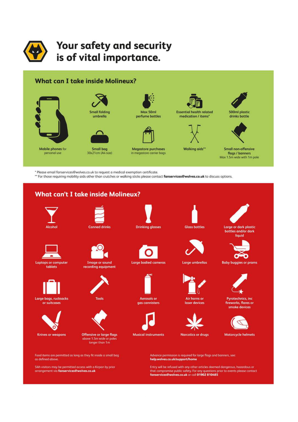 The following articles must not be brought within the Ground. Any person in possession of such items will be refused entry to the Ground